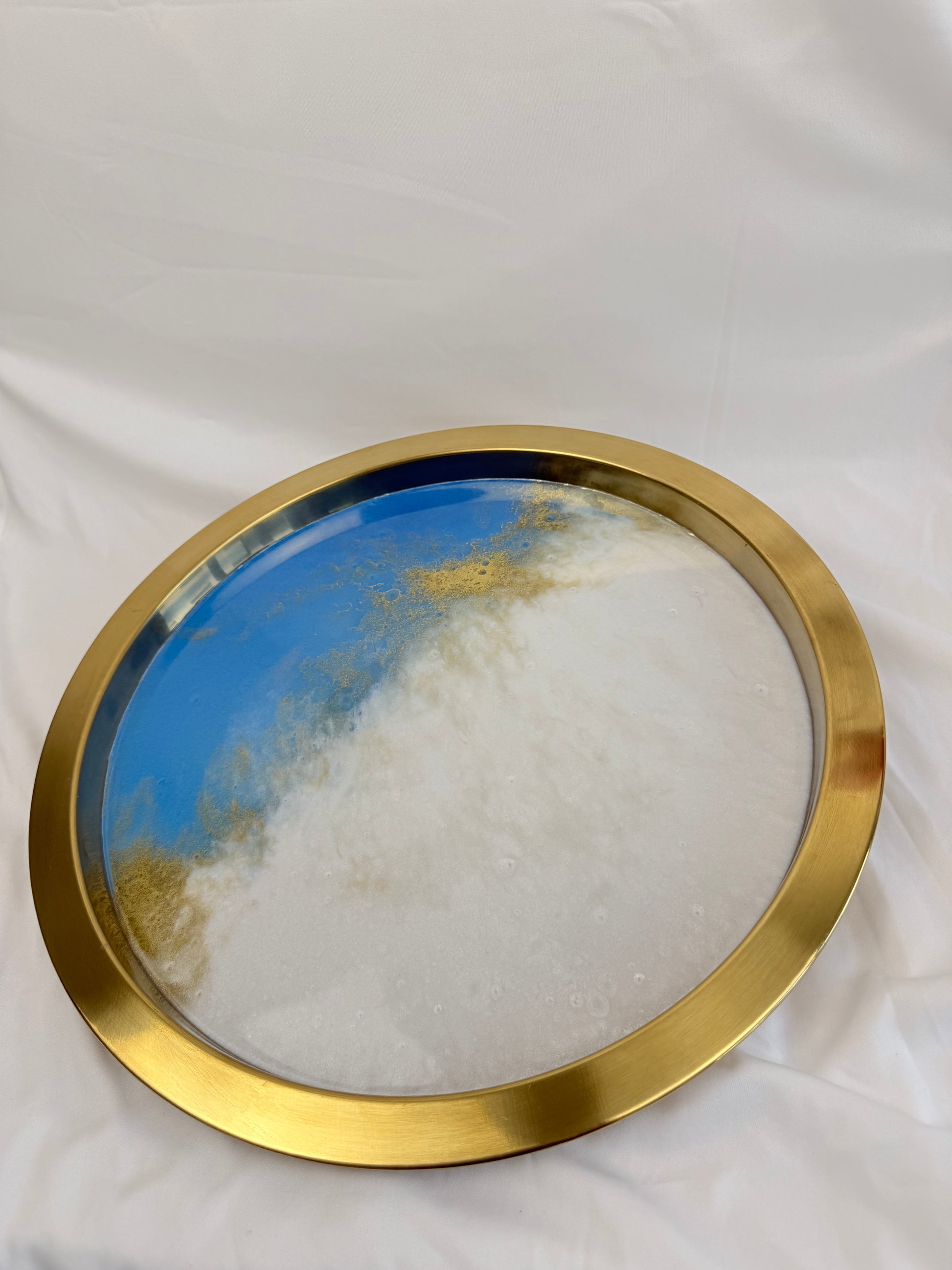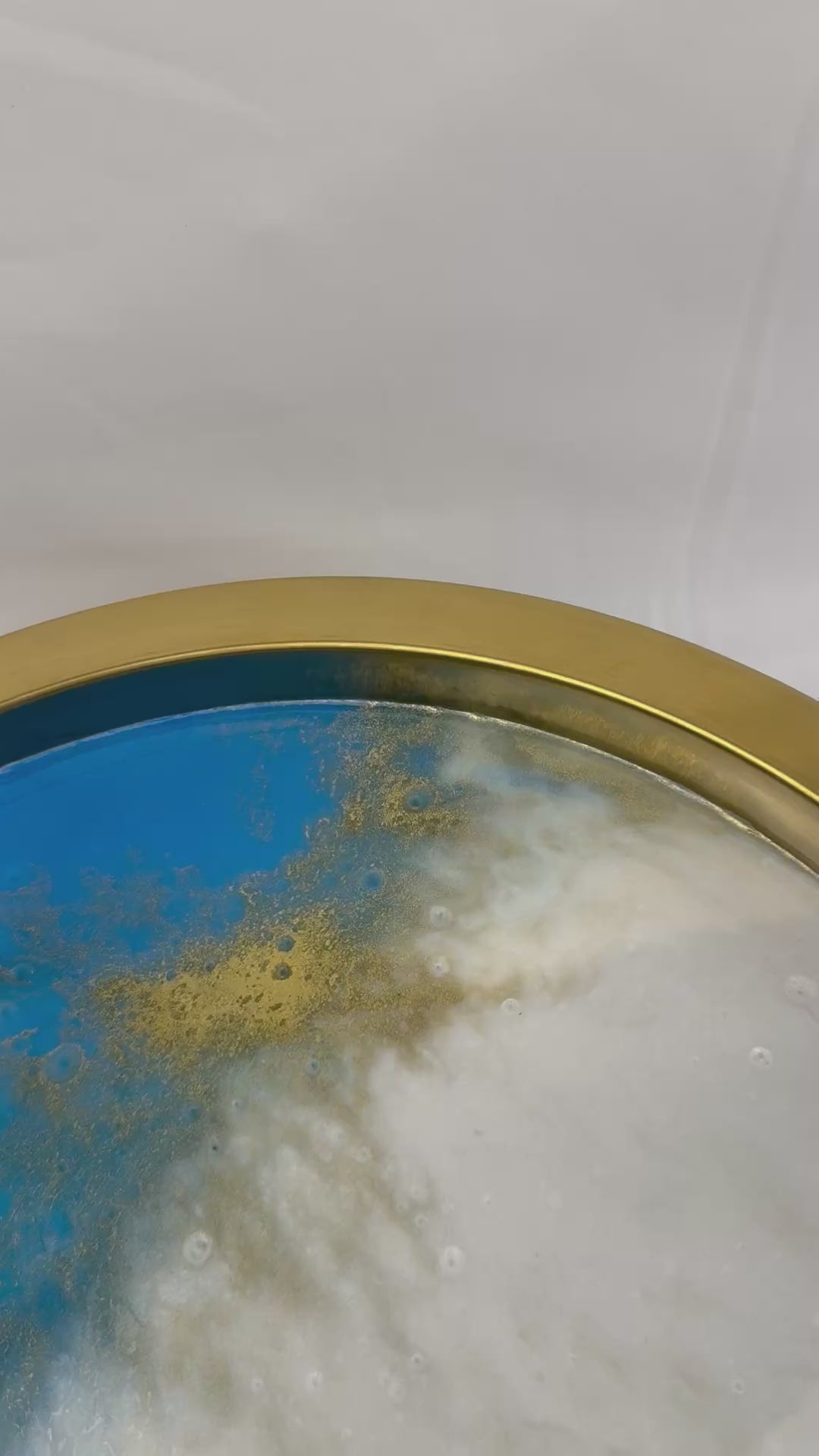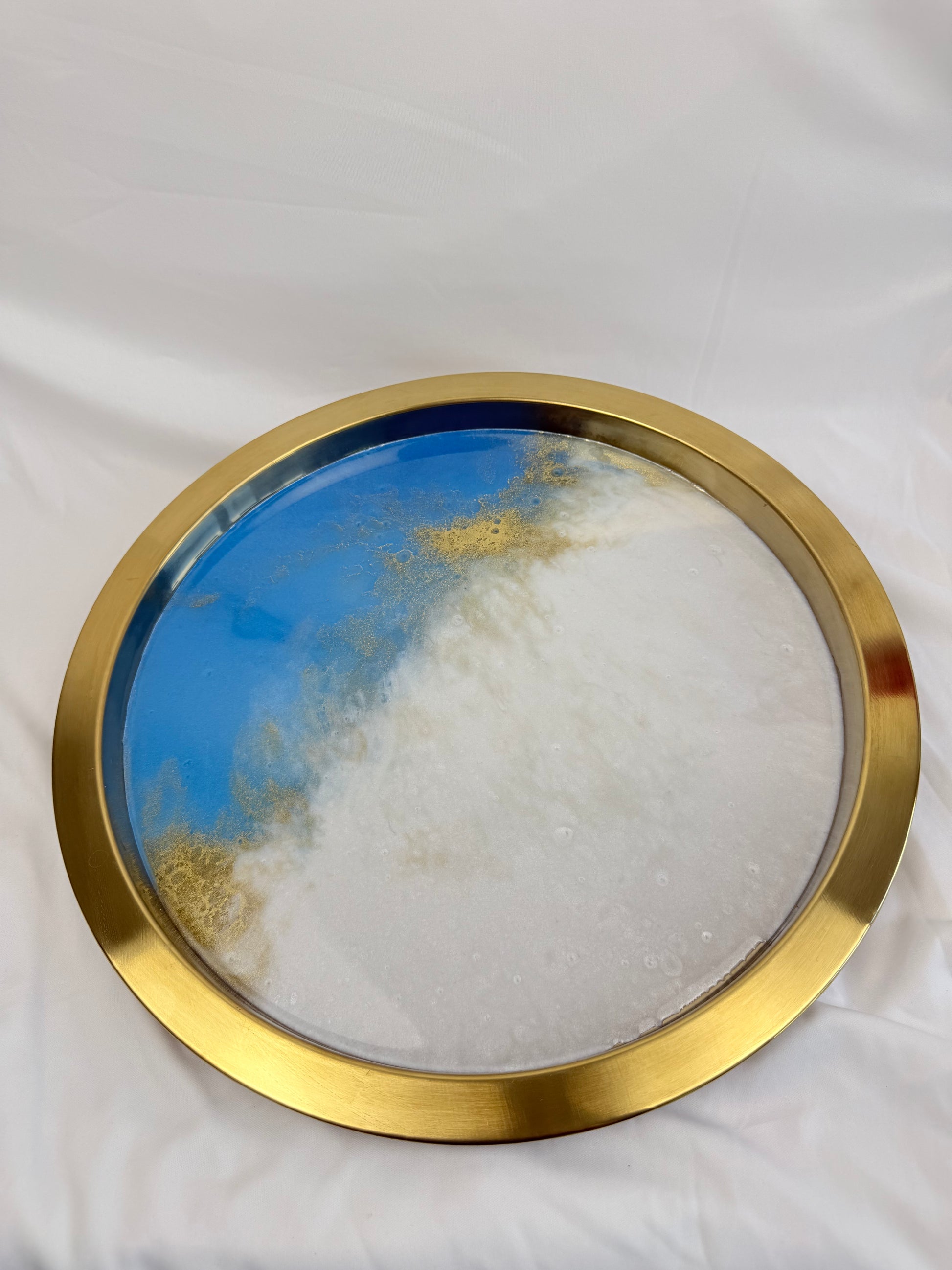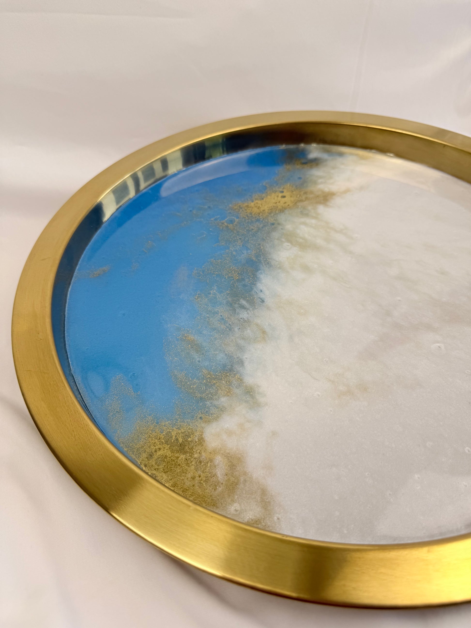 Timeless elegance takes shape in the Golden Resin Tray, a round tray in handcrafted resin that blends aesthetics and functionality. Inspired by the allure of the sea 🌊and its golden reflections✨, this unique piece features a harmonious mix of intense blue, sparkling white and gold accents, recreating the effect of a wave caressing the shore at sunset.