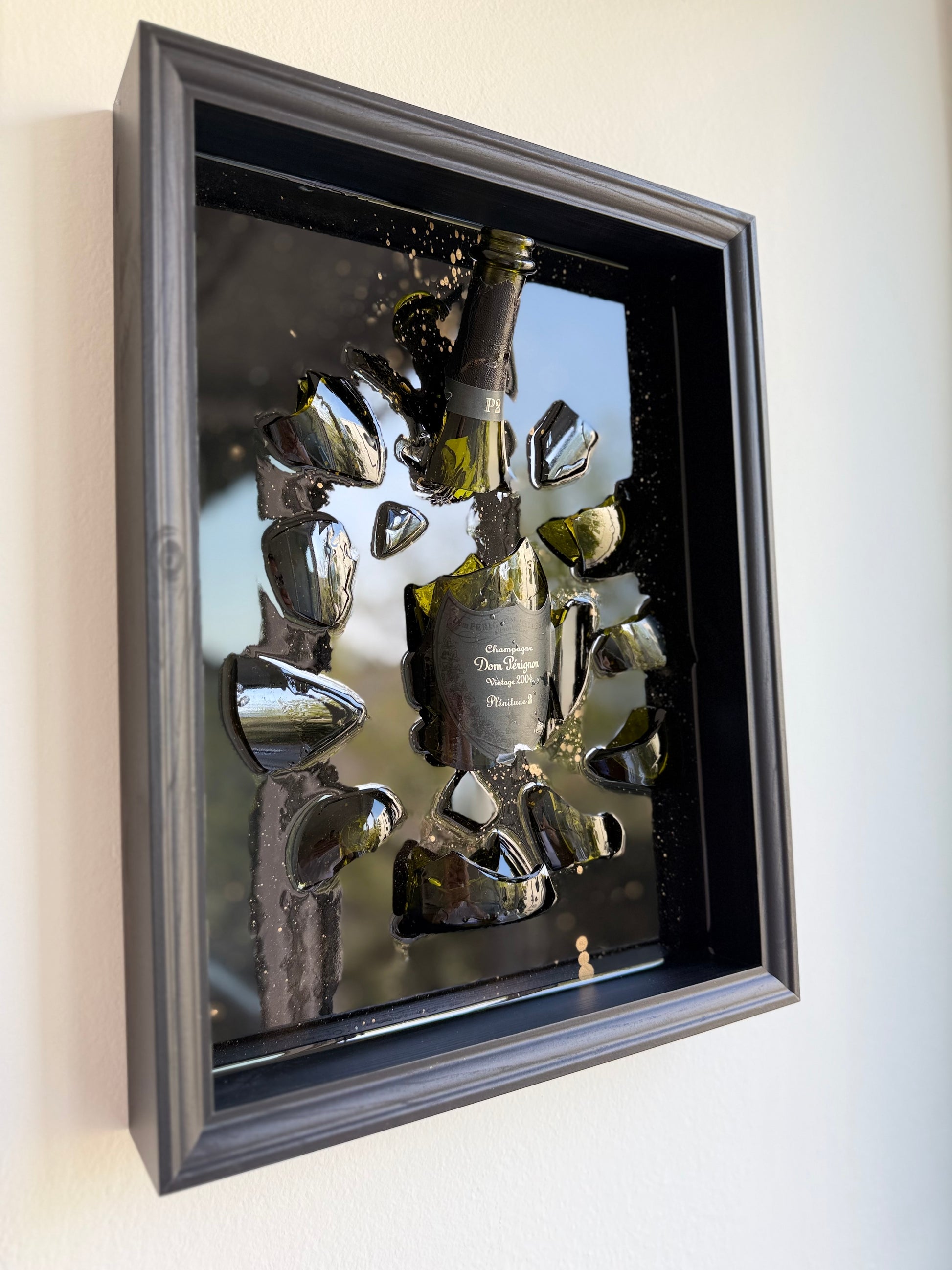 Ogni quadro è un racconto irripetibile, scolpito nel tempo e nella trasparenza. Frammenti di bottiglie che hanno celebrato emozioni autentiche – champagne pregiati, distillati iconici – trovano nuova vita in un’opera d’arte sospesa, incastonata in resina e luce.